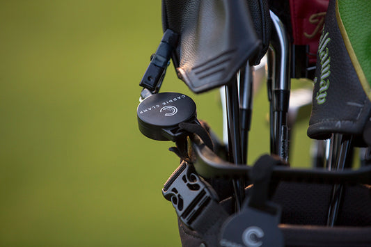 Caddie Clamp is a compact, easy-to-attach golf accessory featuring a retractable cord. Attach one end to your golf bag with the convenient Velcro strap, while the other end clips to your headcover, glove, hat, or towel, ensuring you never lose your gear.